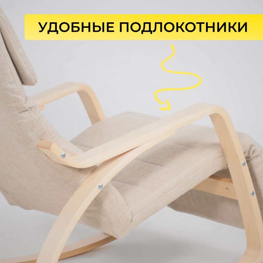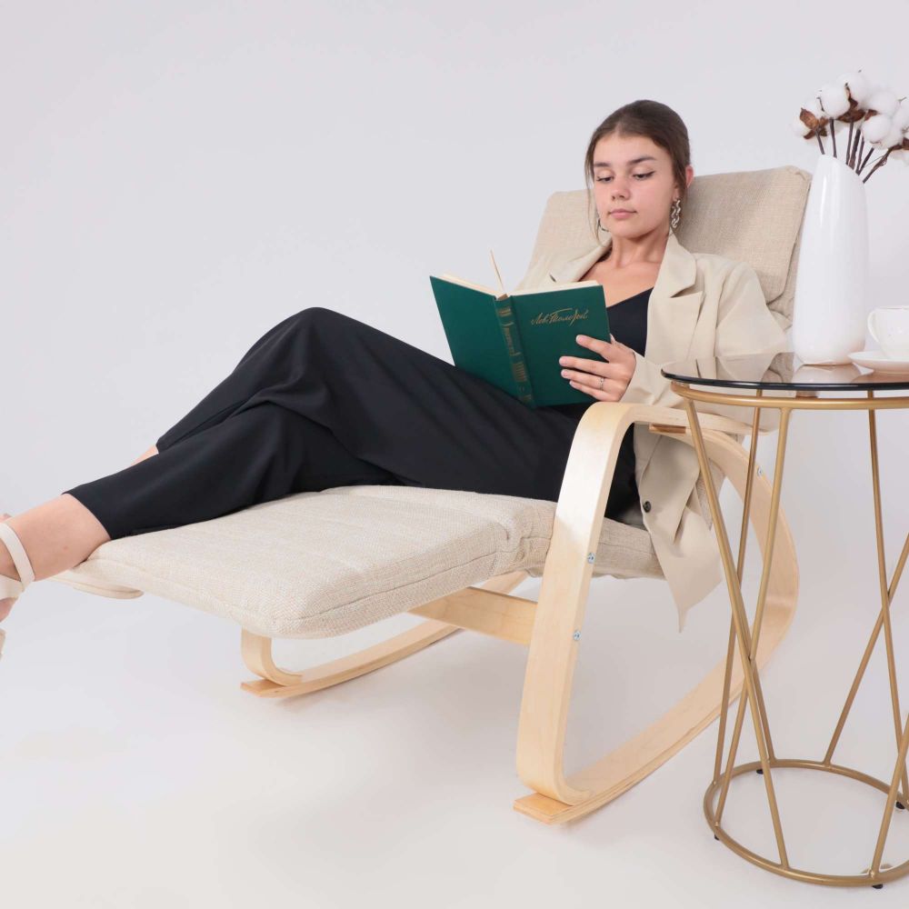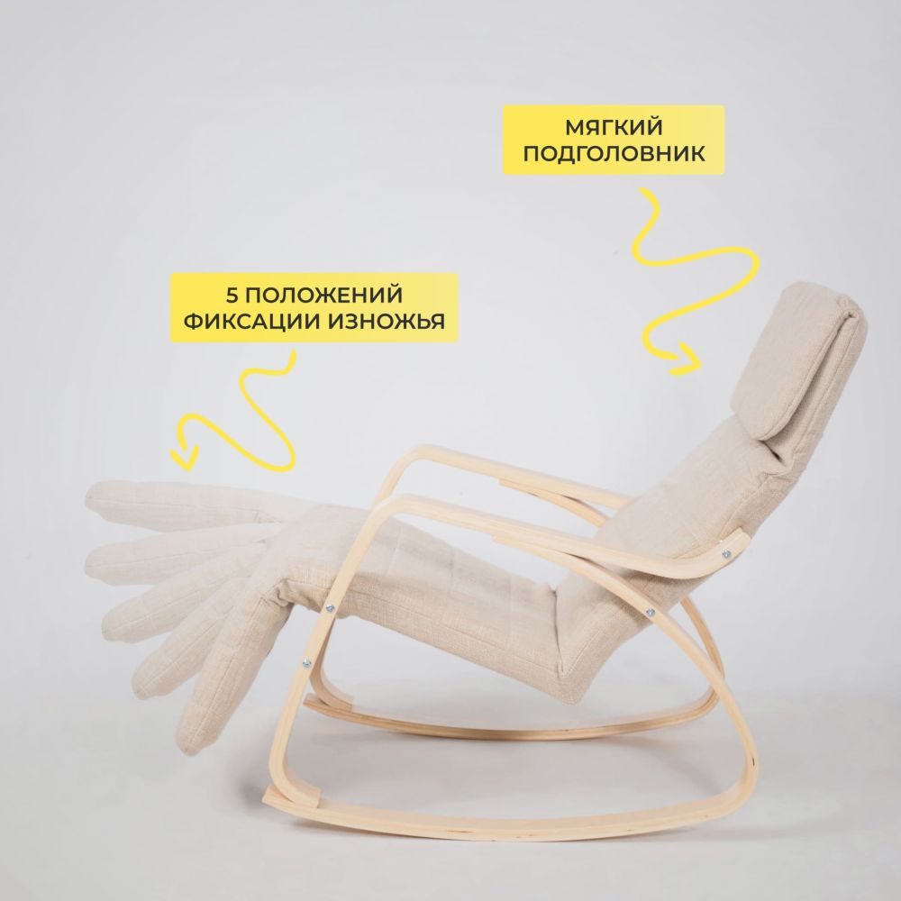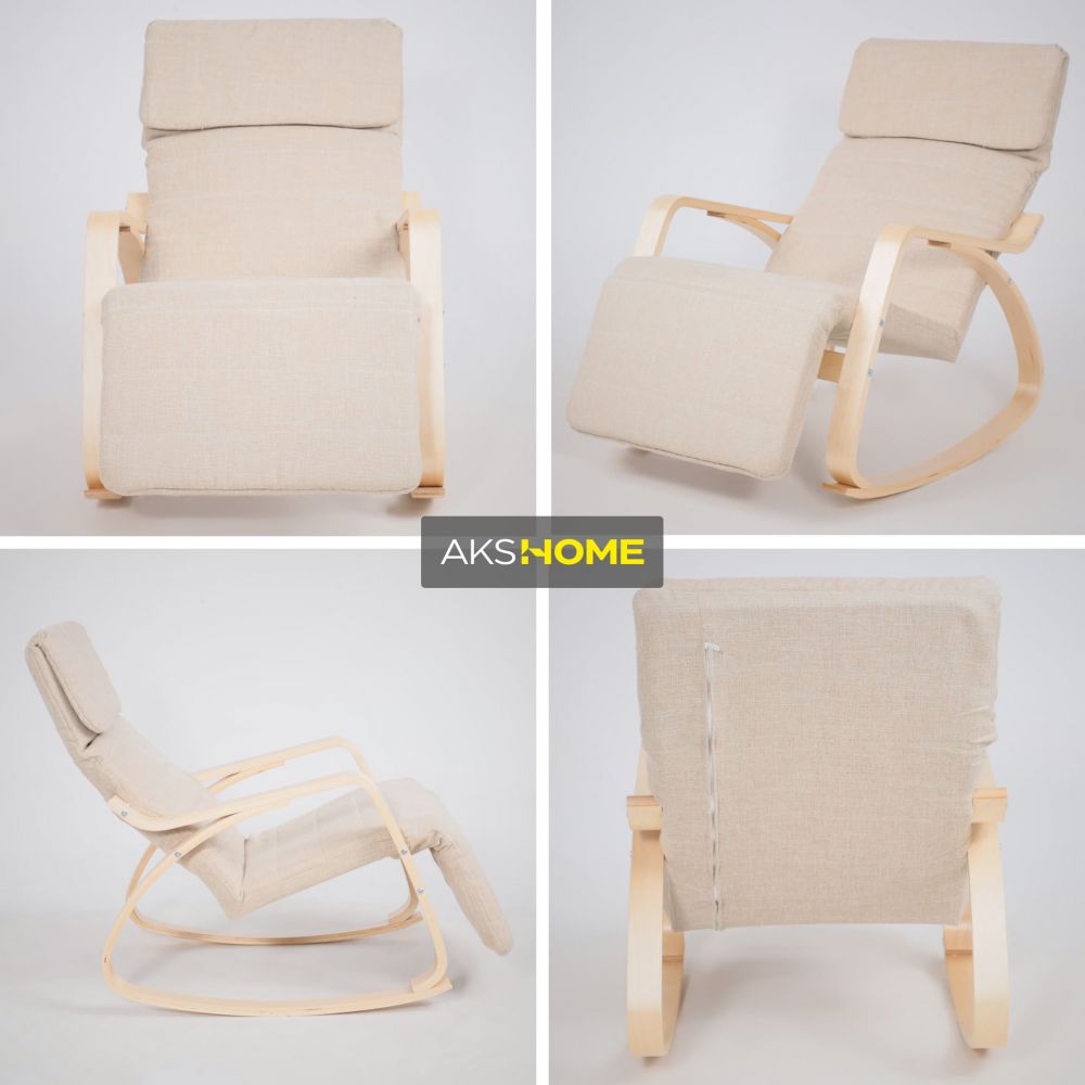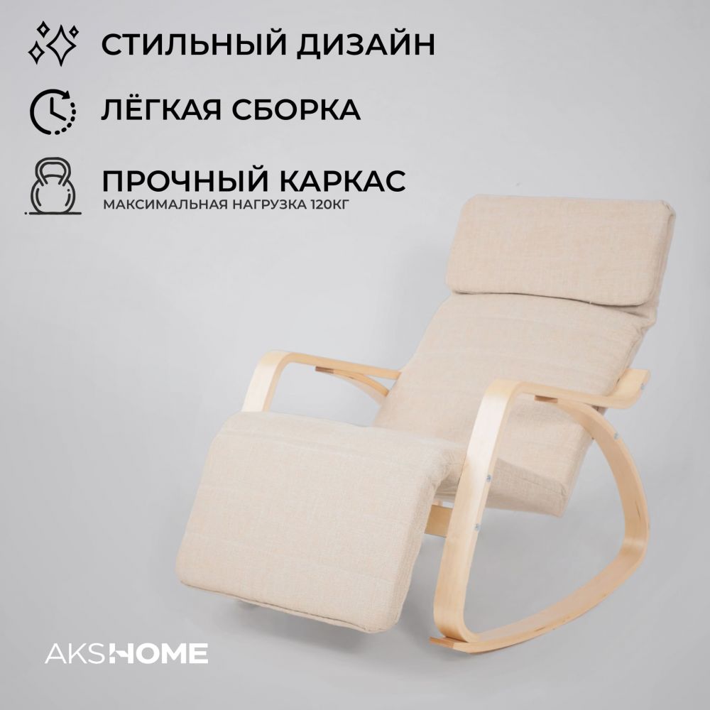 Кресло-качалка изготовлена из износостойкой ткани и натуральной древесины. Есть выступающий подголовик, и регулируемая подножка. Подойдет для дома, садовой зоны, а так же общественного места.
