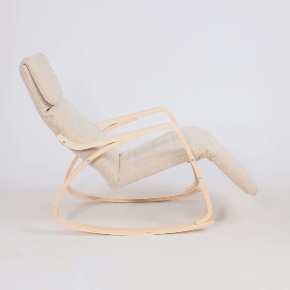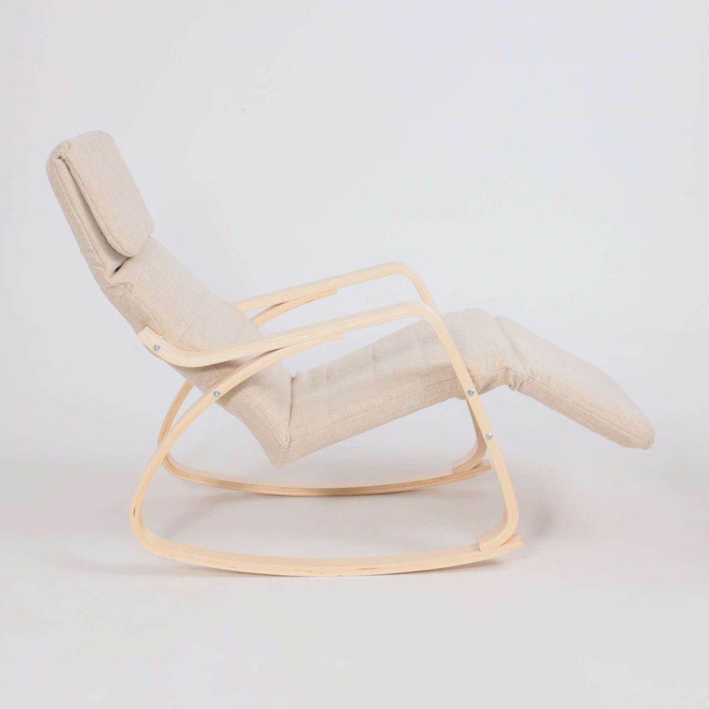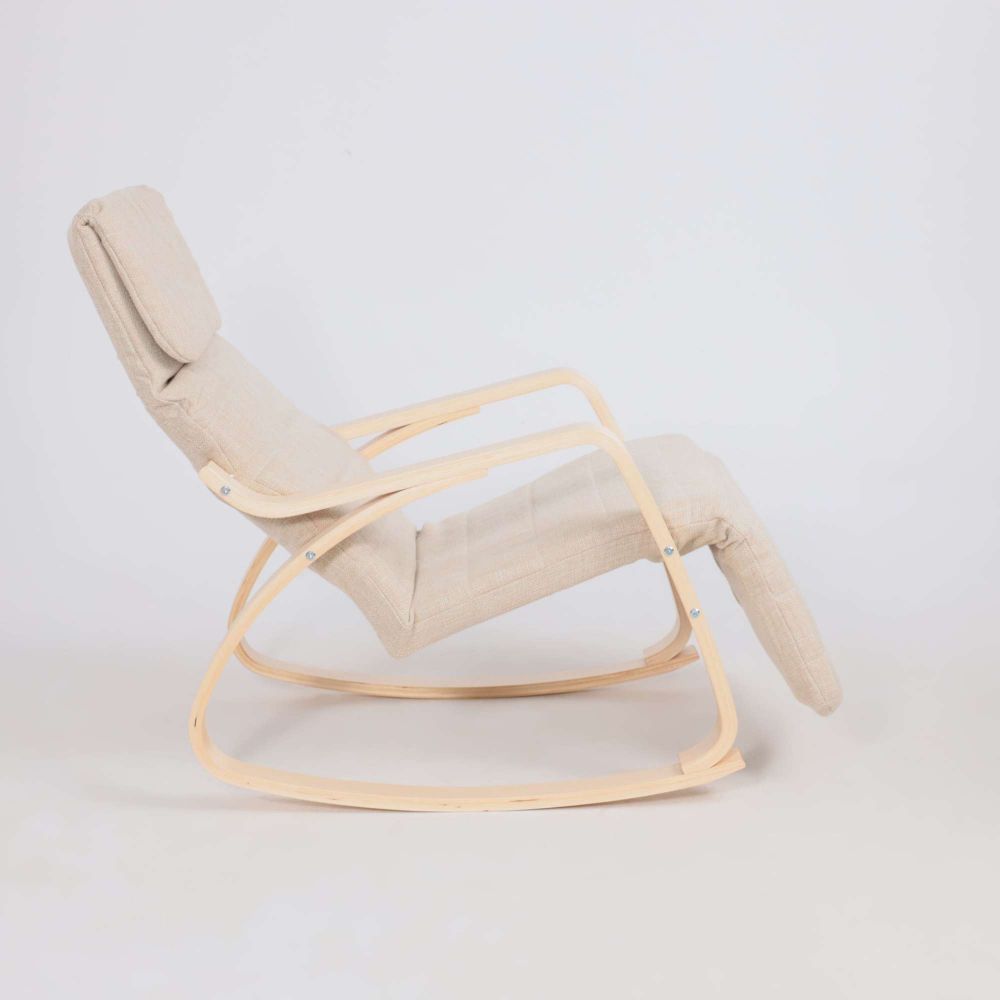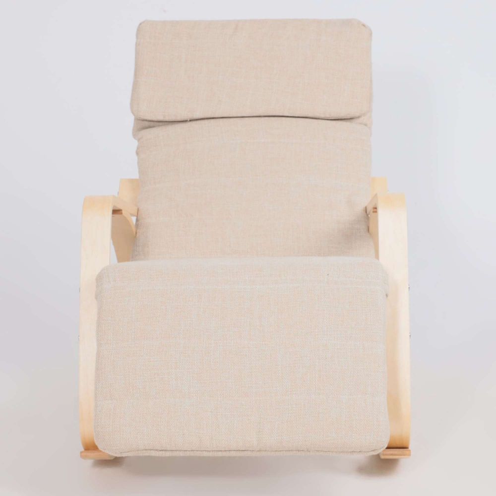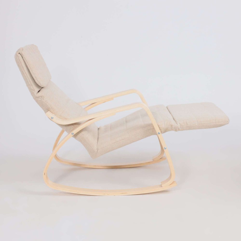 Кресло-качалка изготовлена из износостойкой ткани и натуральной древесины. Есть выступающий подголовик, и регулируемая подножка. Подойдет для дома, садовой зоны, а так же общественного места.