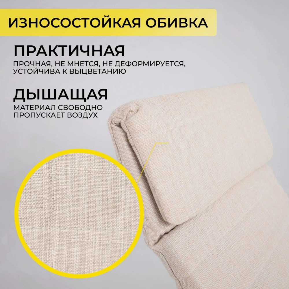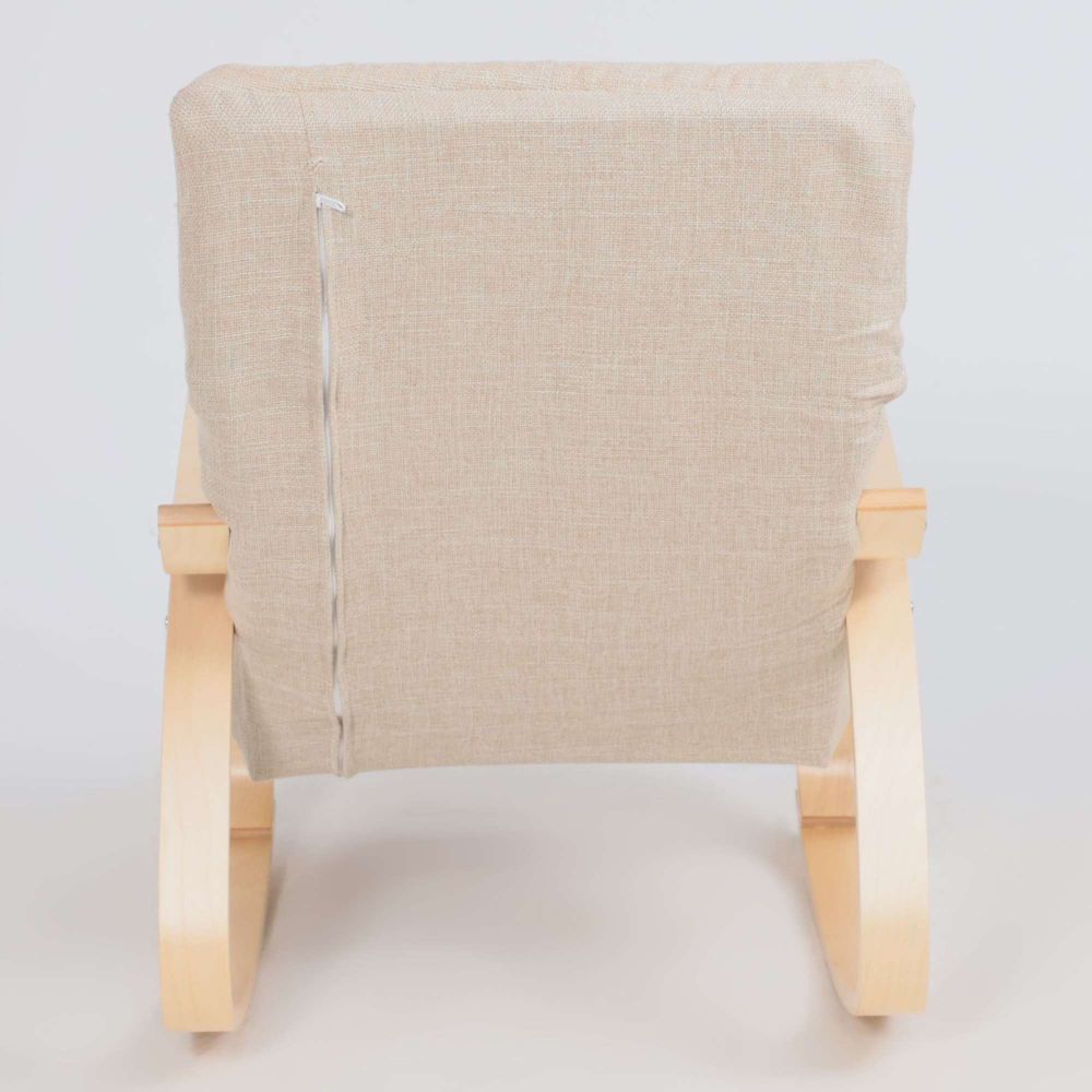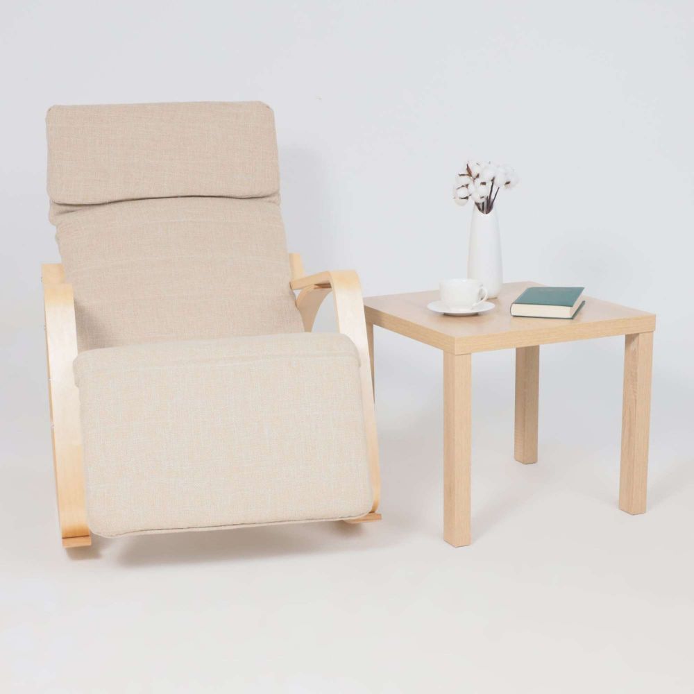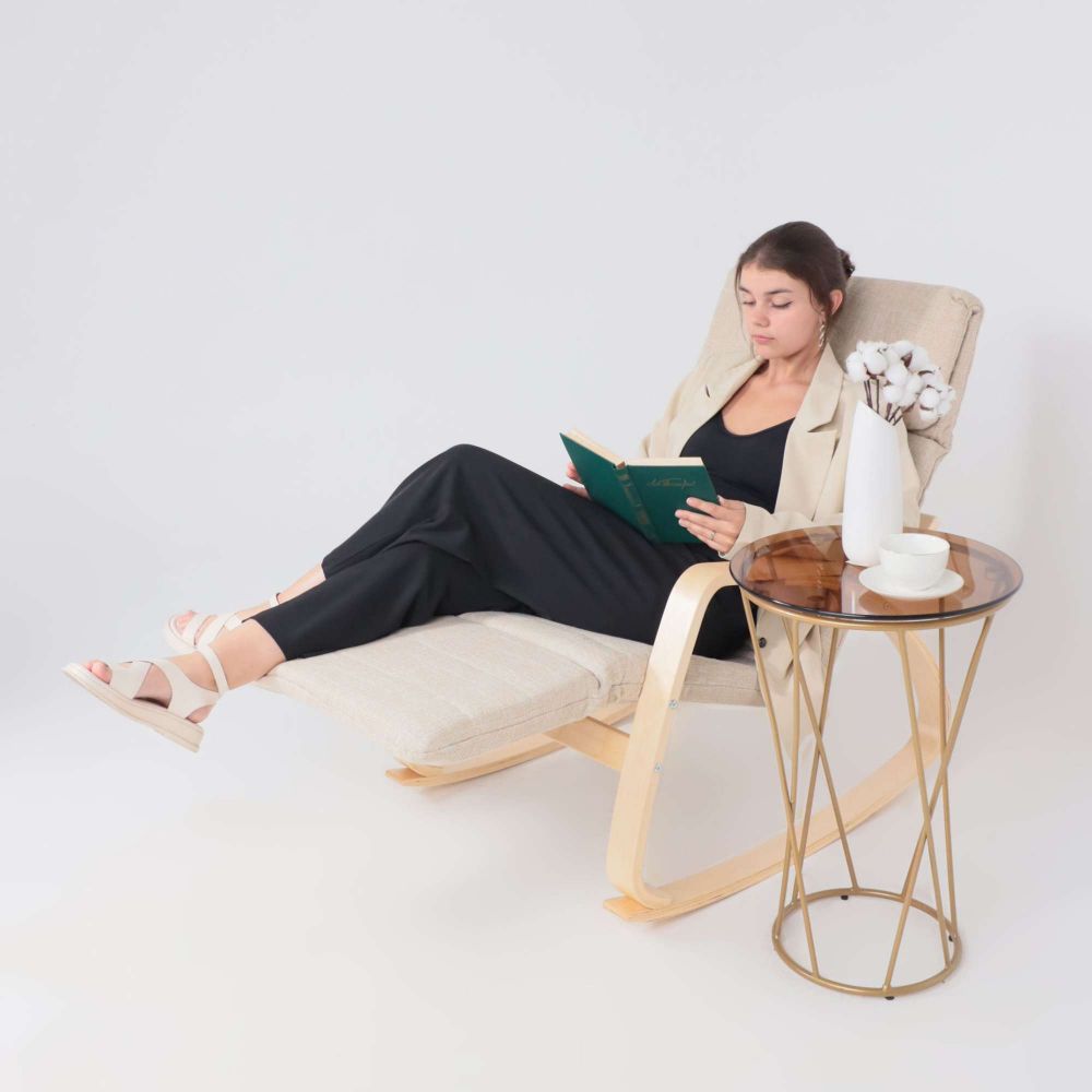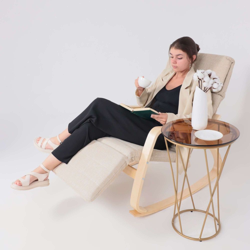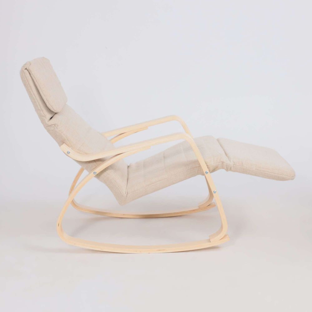 Кресло-качалка изготовлена из износостойкой ткани и натуральной древесины. Есть выступающий подголовик, и регулируемая подножка. Подойдет для дома, садовой зоны, а так же общественного места.
