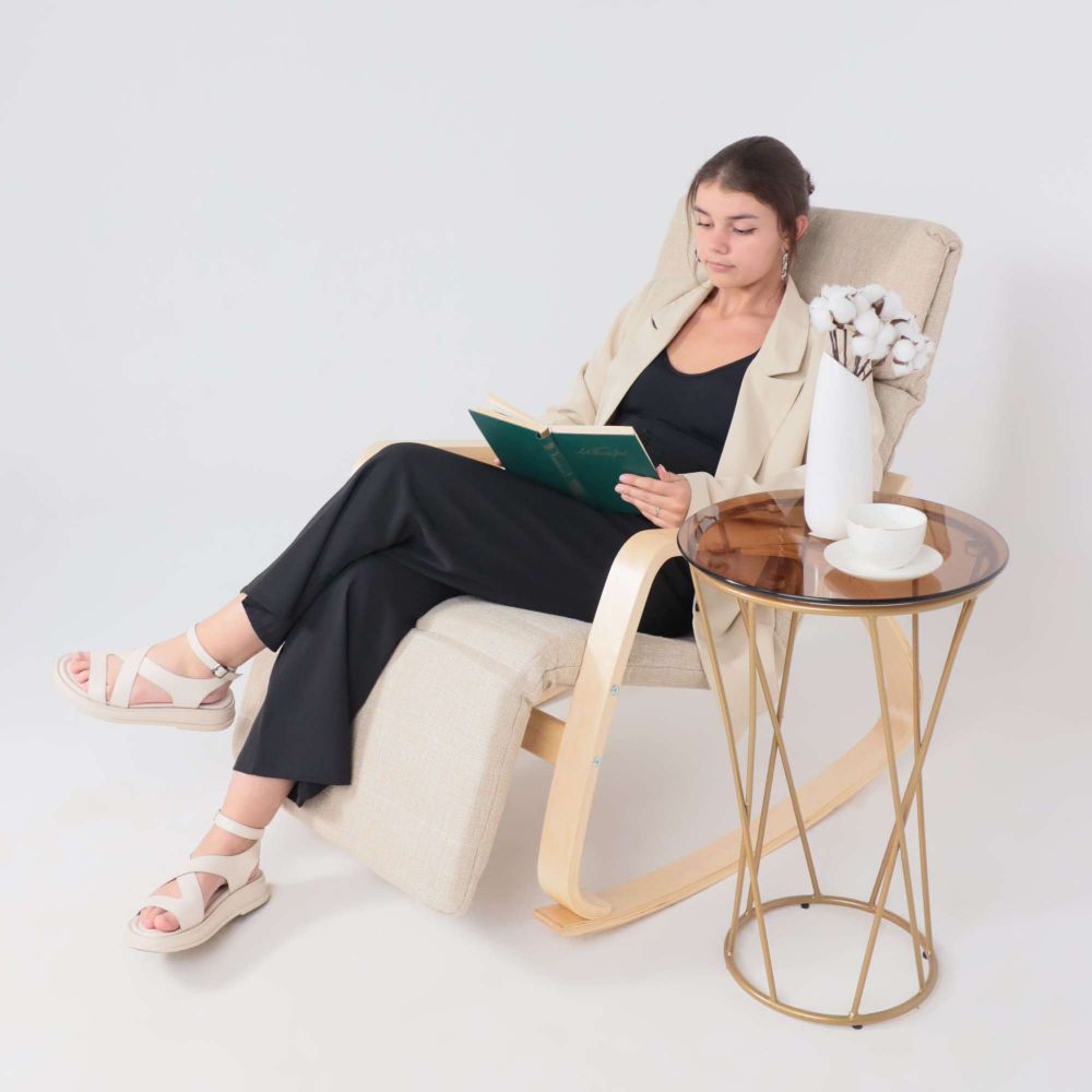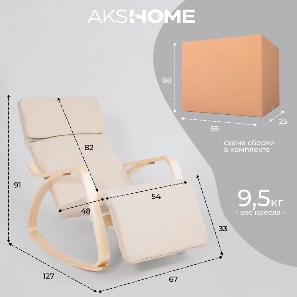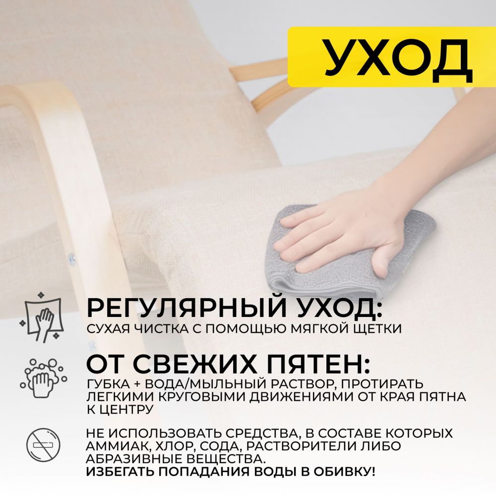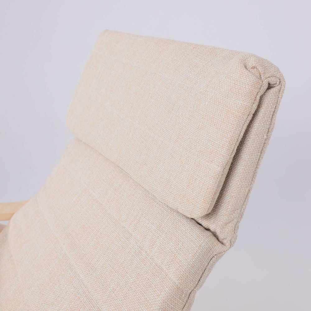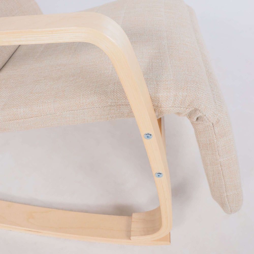 Кресло-качалка изготовлена из износостойкой ткани и натуральной древесины. Есть выступающий подголовик, и регулируемая подножка. Подойдет для дома, садовой зоны, а так же общественного места.