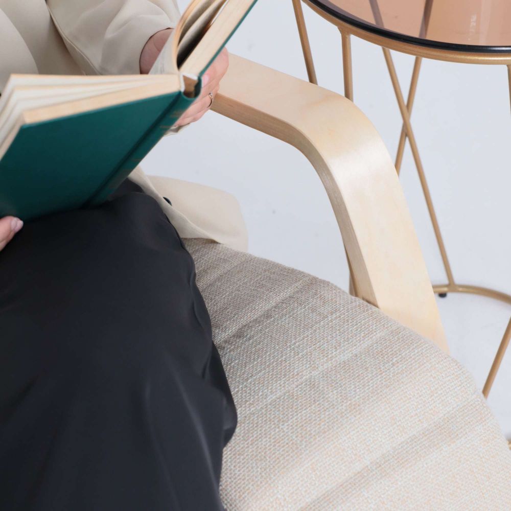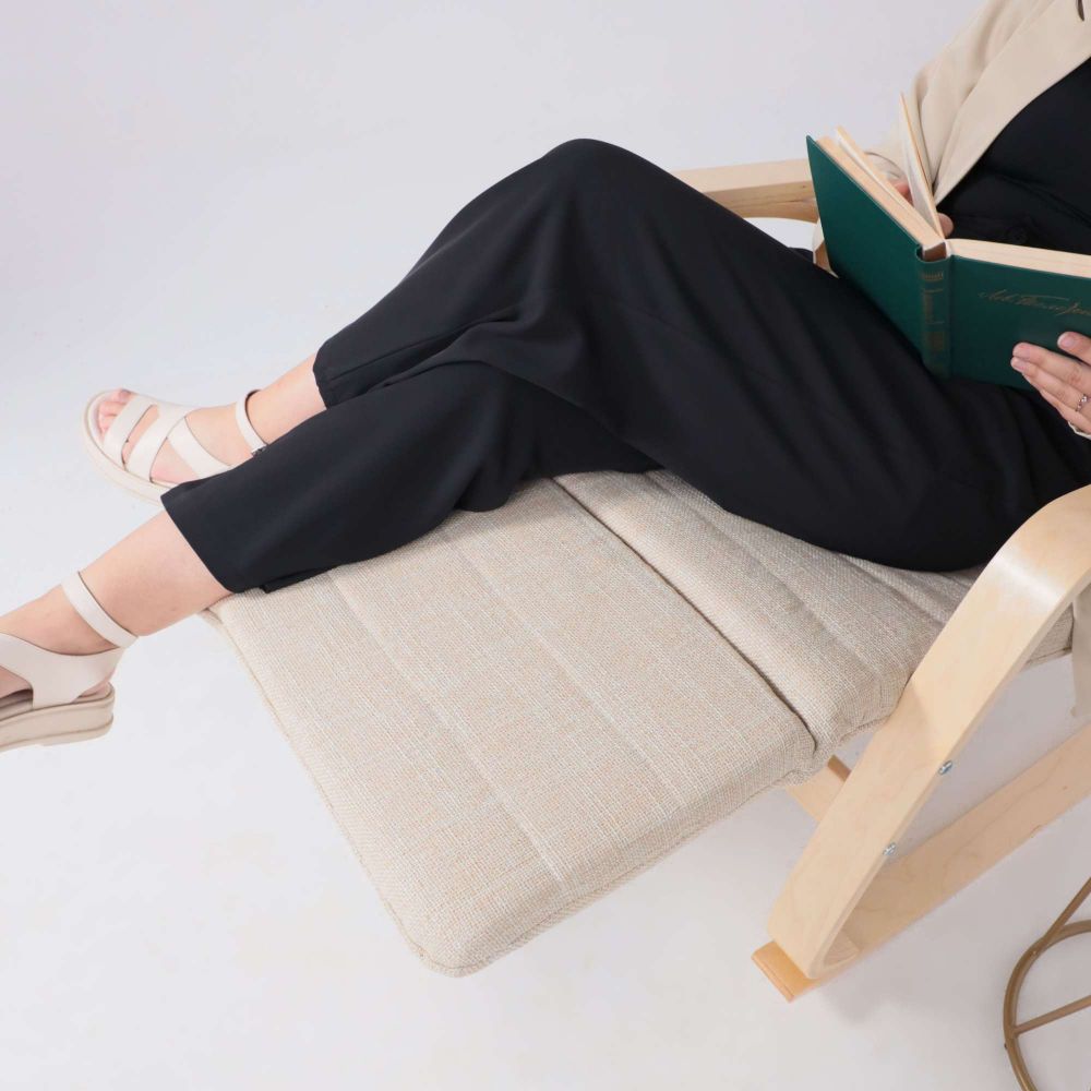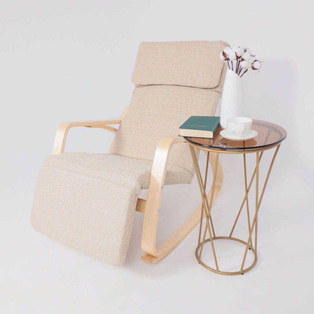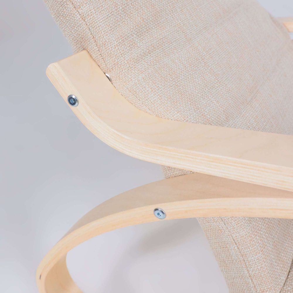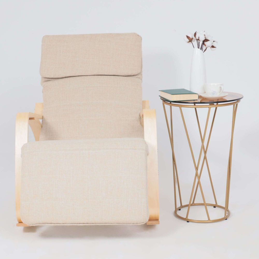 Кресло-качалка изготовлена из износостойкой ткани и натуральной древесины. Есть выступающий подголовик, и регулируемая подножка. Подойдет для дома, садовой зоны, а так же общественного места.