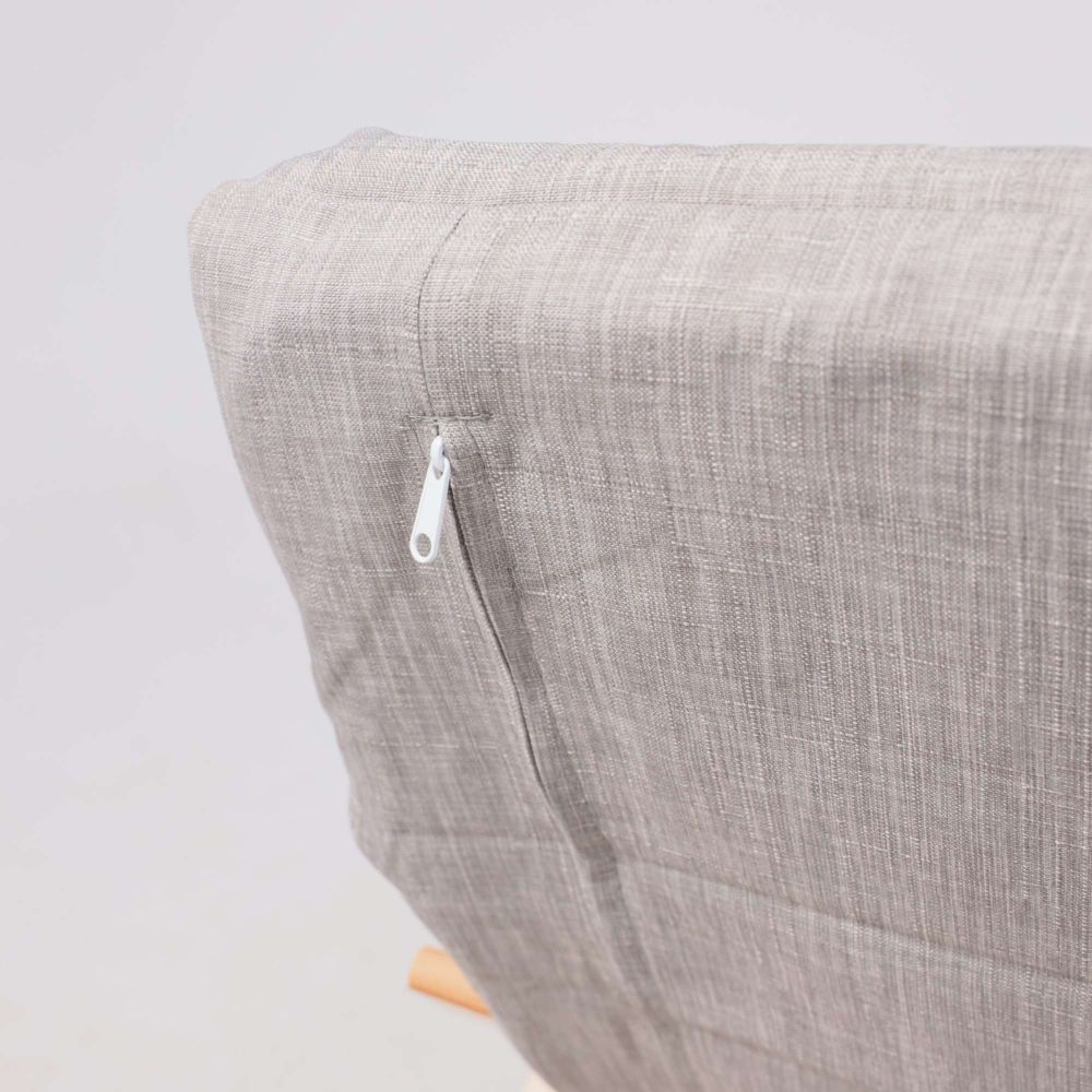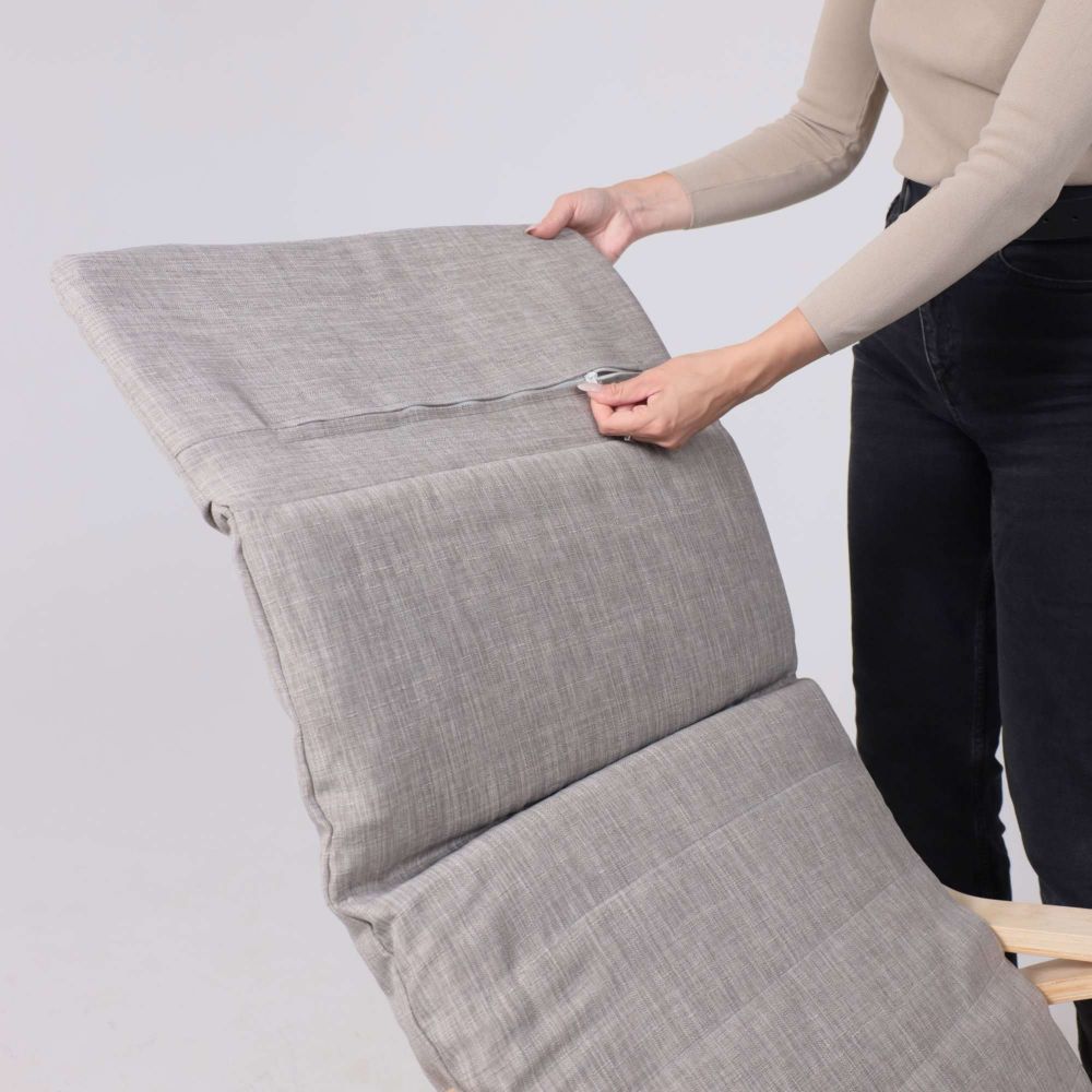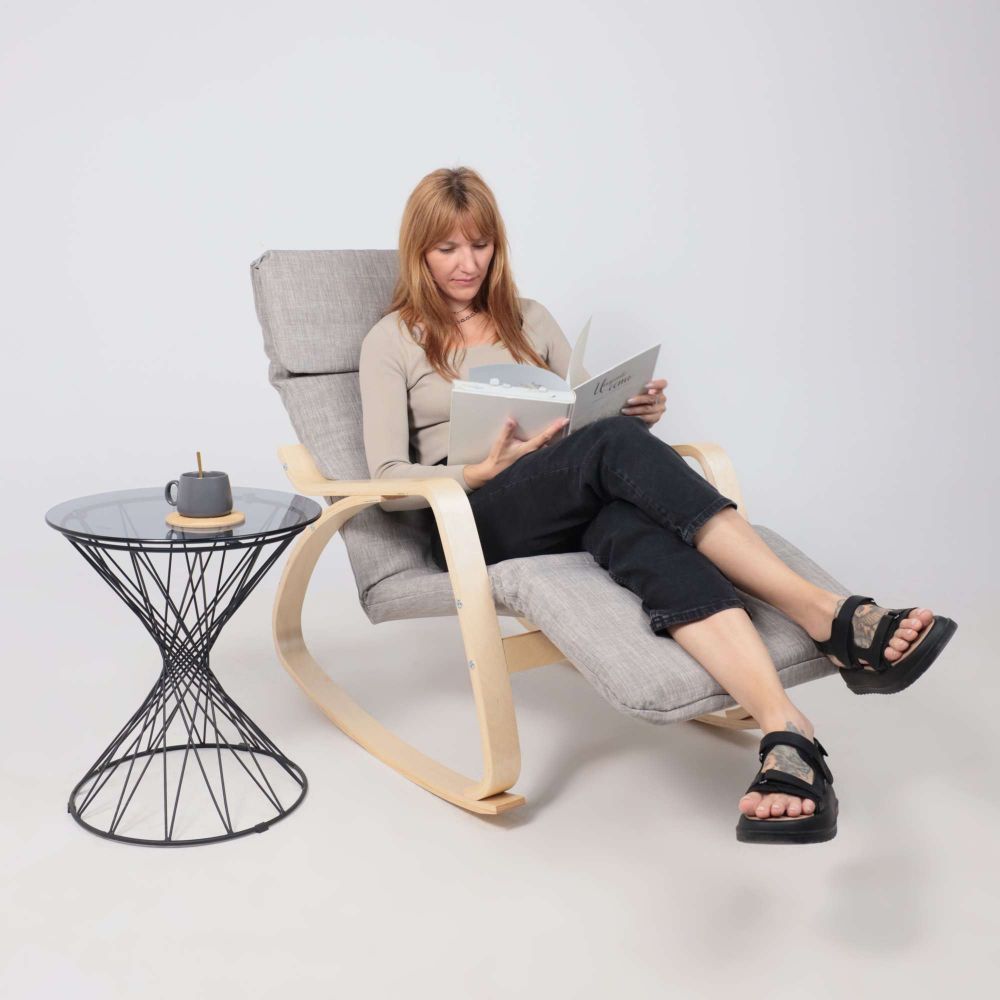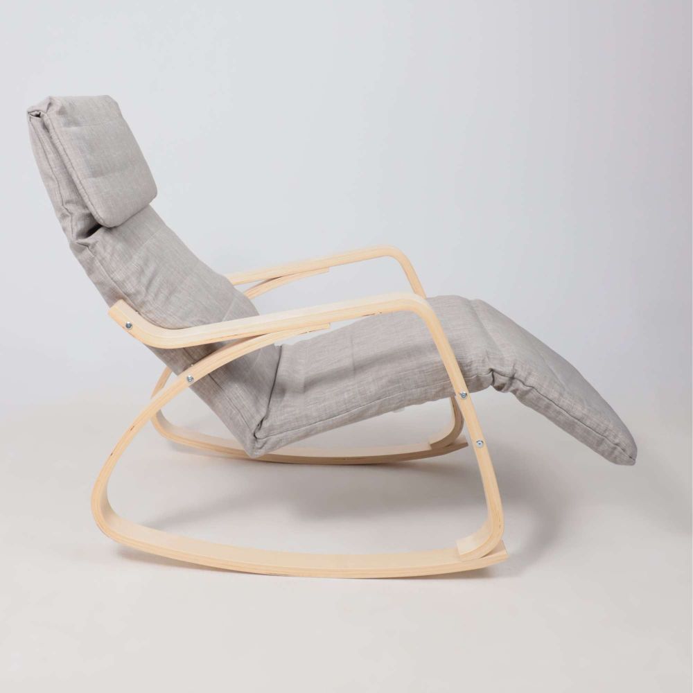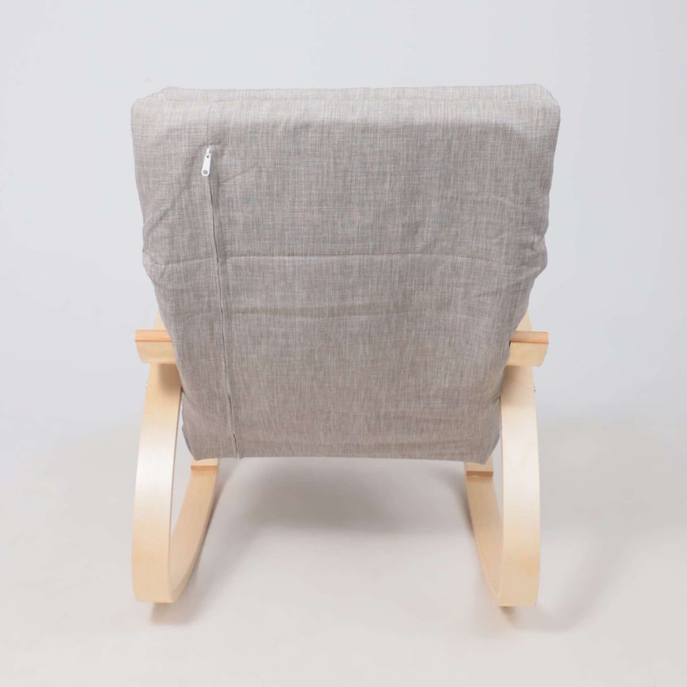 Кресло-качалка изготовлена из износостойкой ткани и натуральной древесины. Есть выступающий подголовик, и регулируемая подножка. Подойдет для дома, садовой зоны, а так же общественного места.