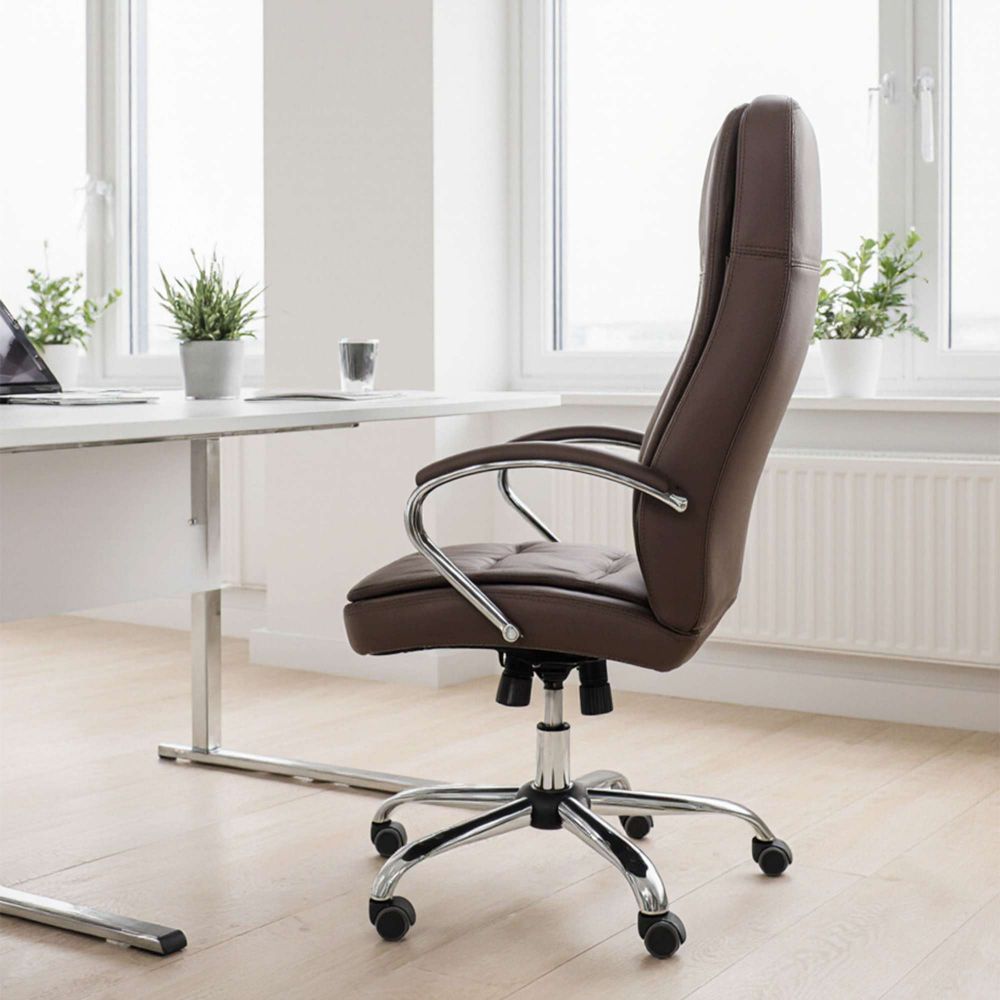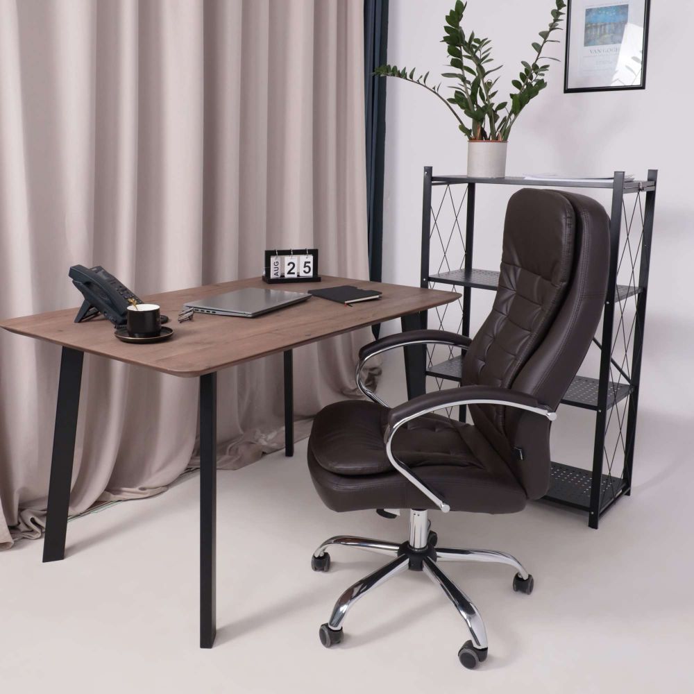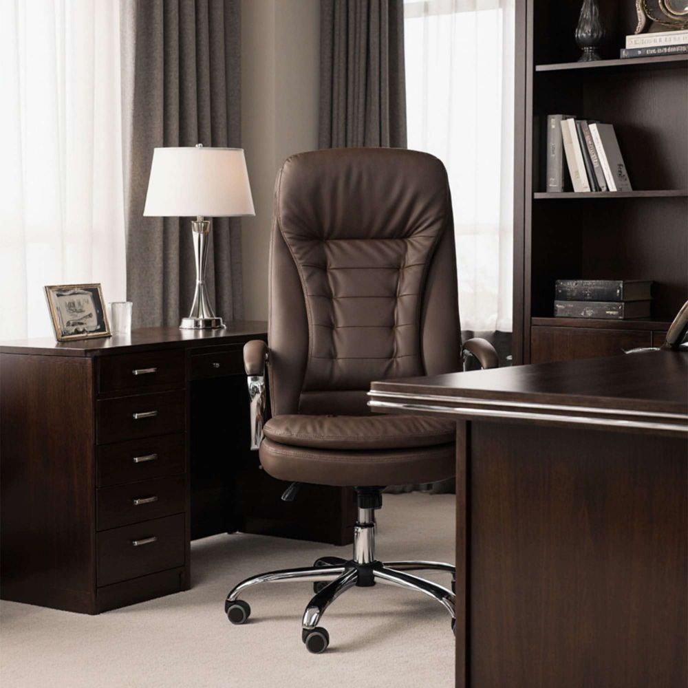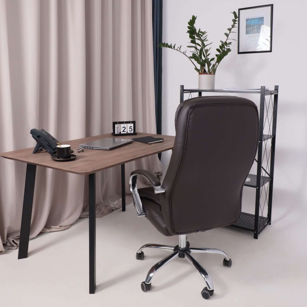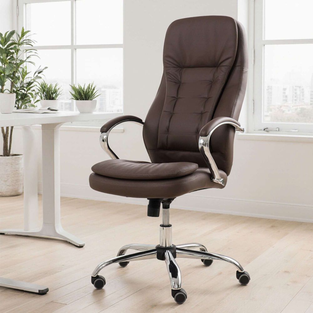Кресло рабочее RICHARD - тепло, стиль и комфорт в одном образе. Глубокий коричневый цвет добавляет интерьеру уюта и благородства. Он менее официальный, чем чёрный, но не менее солидный - идеальный выбор для домашнего кабинета или стильного офиса. Кроме того, коричневый практичен: он не боится ежедневной эксплуатации и легко сочетается с тёплыми оттенками мебели и пола. Обивка из мягкой экокожи приятна на ощупь и проста в уходе. Механизм Tilt позволяет креслу адаптироваться под ваше тело - фиксируйте наклон, регулируйте жёсткость и оставайтесь в комфорте весь день. Прочная металлическая крестовина с хромированной отделкой и прорезиненные колёса делают модель устойчивой и бережной к полу.
