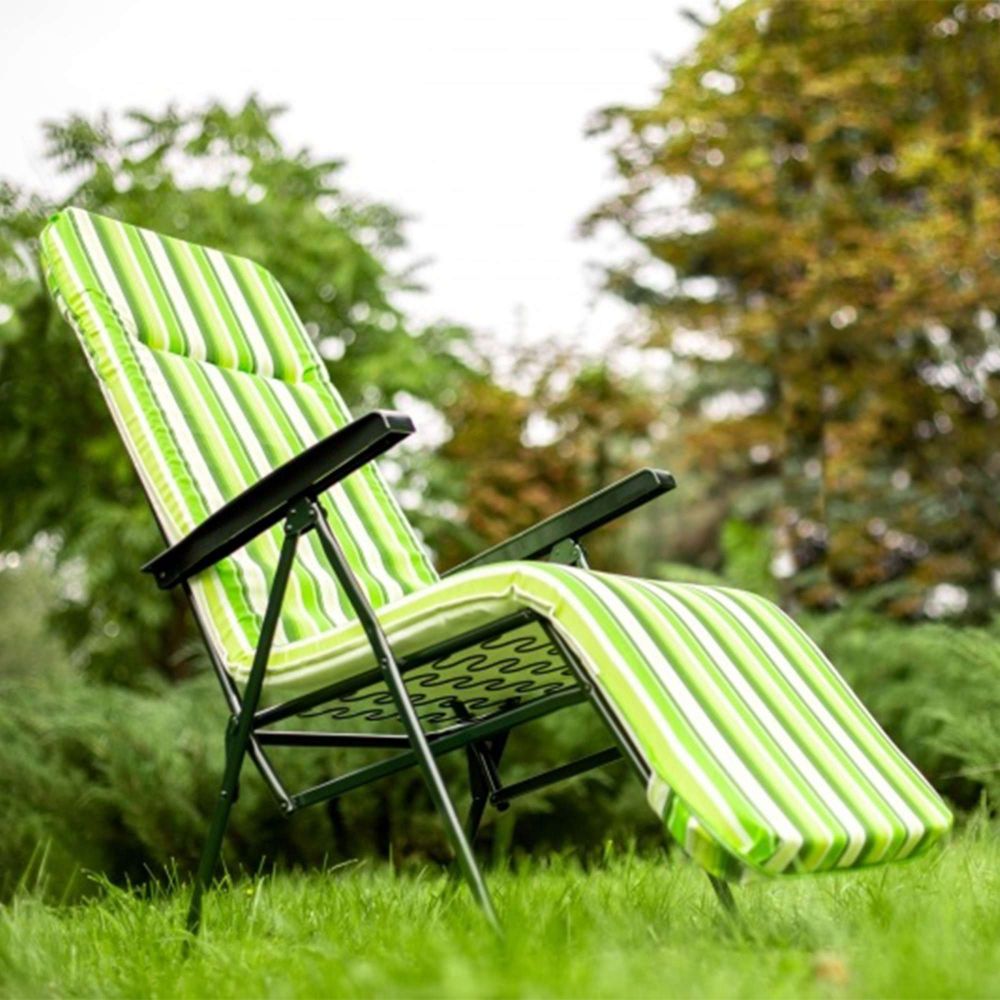 Удобное кресло-шезлонг может быть использовано в саду, а также в дачном домике. Поролон толщиной 5 см, обивка из хлопка. Основание - прочная сталь. Каркас с пружинной змейкой.