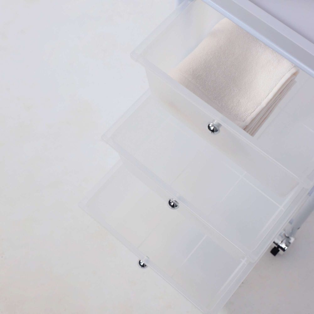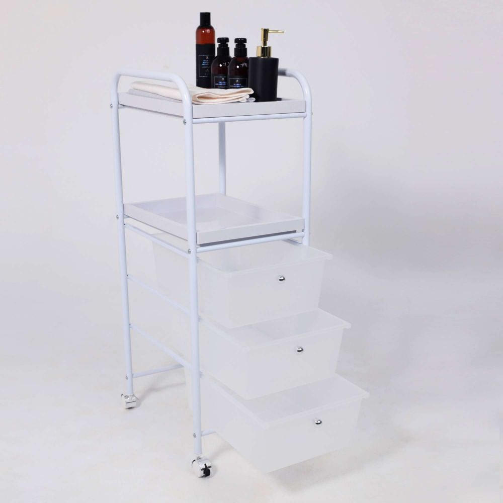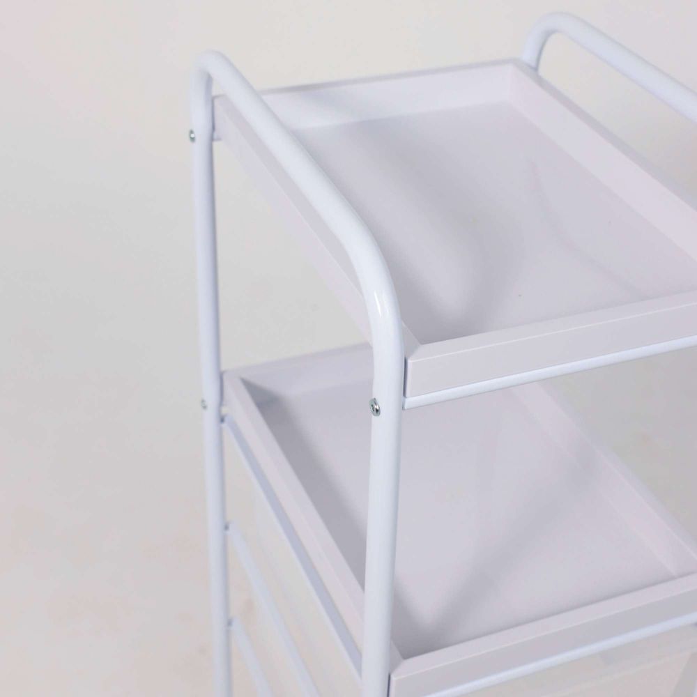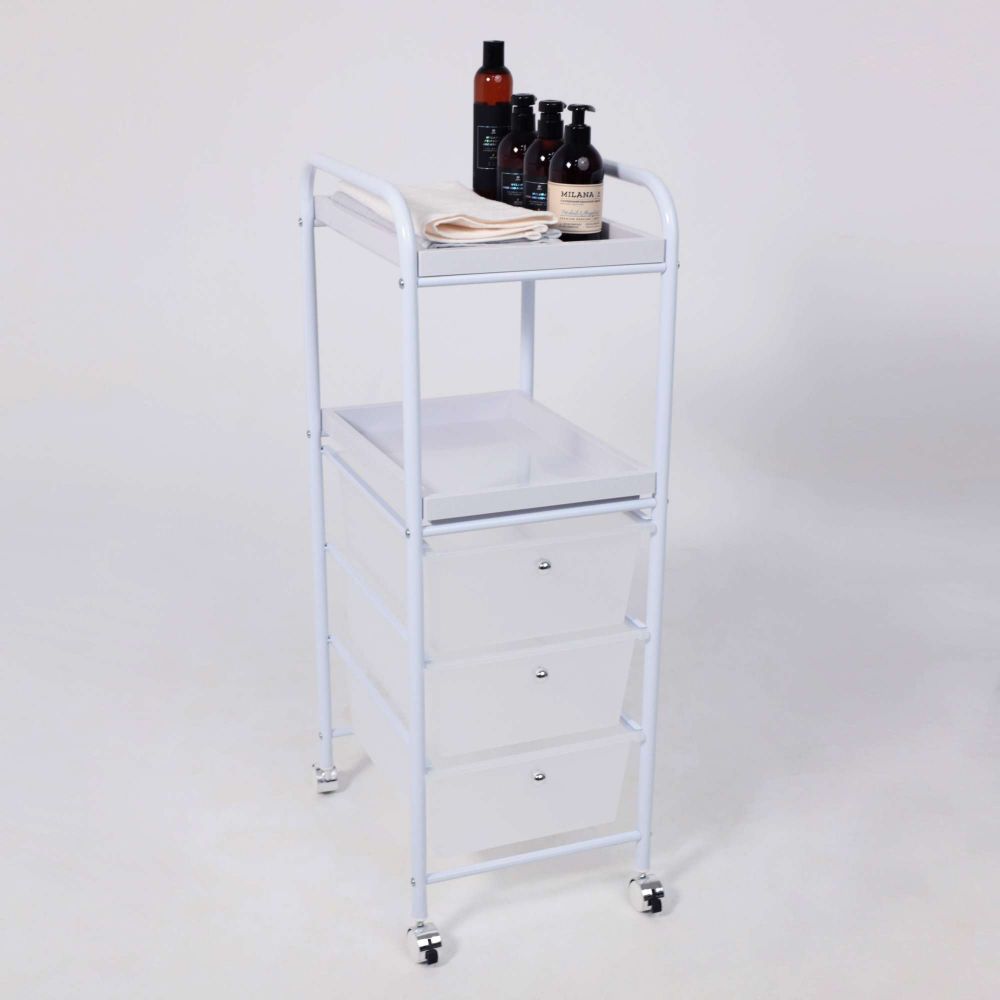 Полка-тележка PLUTON в белом цвете представляет собой универсальный и многофункциональный элемент интерьера, который поможет эффективно организовать Ваше домашнее пространство. Несколько секций для хранения: 3 удобных ящика из пластика и 2 открытые полки из АTS пластика для дополнительных элементов декора: книг, аксессуаров для ванной, канцелярии, косметики и не только. Основание тележки изготовлено из металла. Наличие колесиков позволяет легко перемещать тележку в удобную для Вас локацию. Полка-тележка PLUTON пригодится в любом помещении: ванной, прихожей, детской, рабочем кабинете и даже в салонах красоты. Размеры тележки: ширина 330 мм., глубина 400 мм., высота 940 мм. Размеры ящика: ширина 290 мм, глубина 390 мм, высота 140 мм.