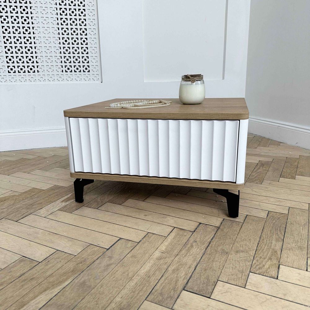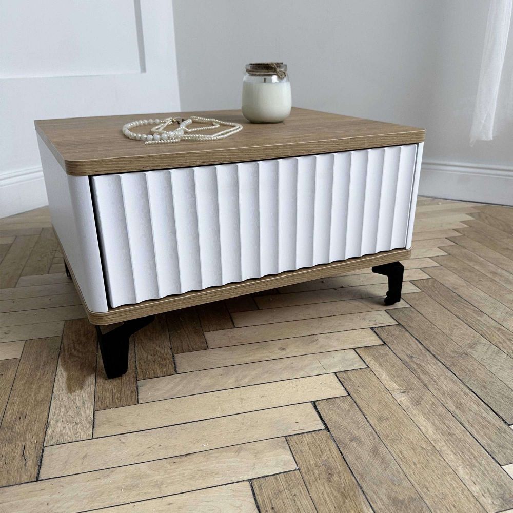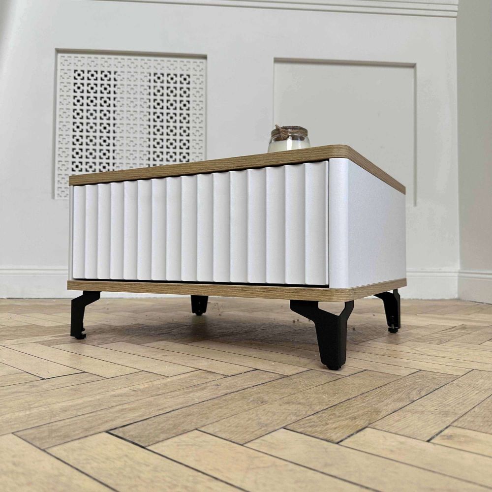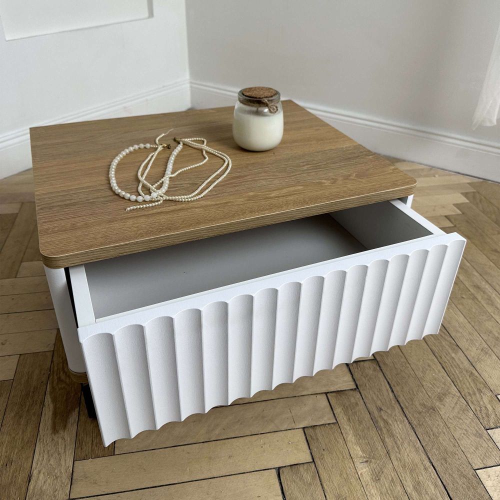 Особенность - фрезерованный фасад из пленки ПВХ с 3D фрезеровкой «Волна». Корпус из МДФ с покрытием пленки. Крышка и дно с закруглением из ЛДСП. Направляющие скрытого монтажа push to open.