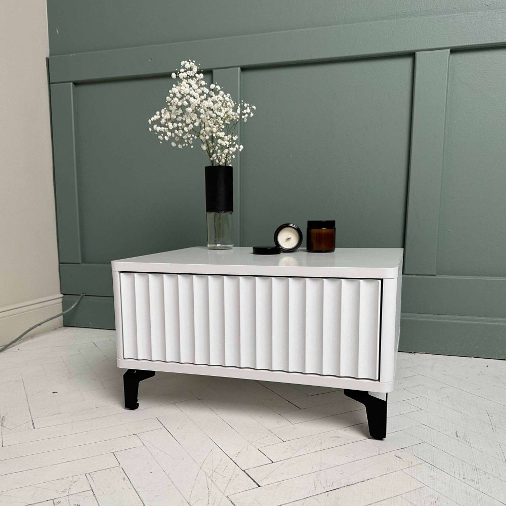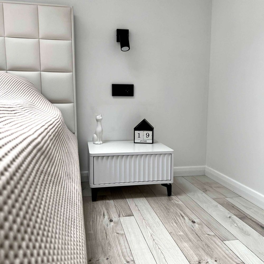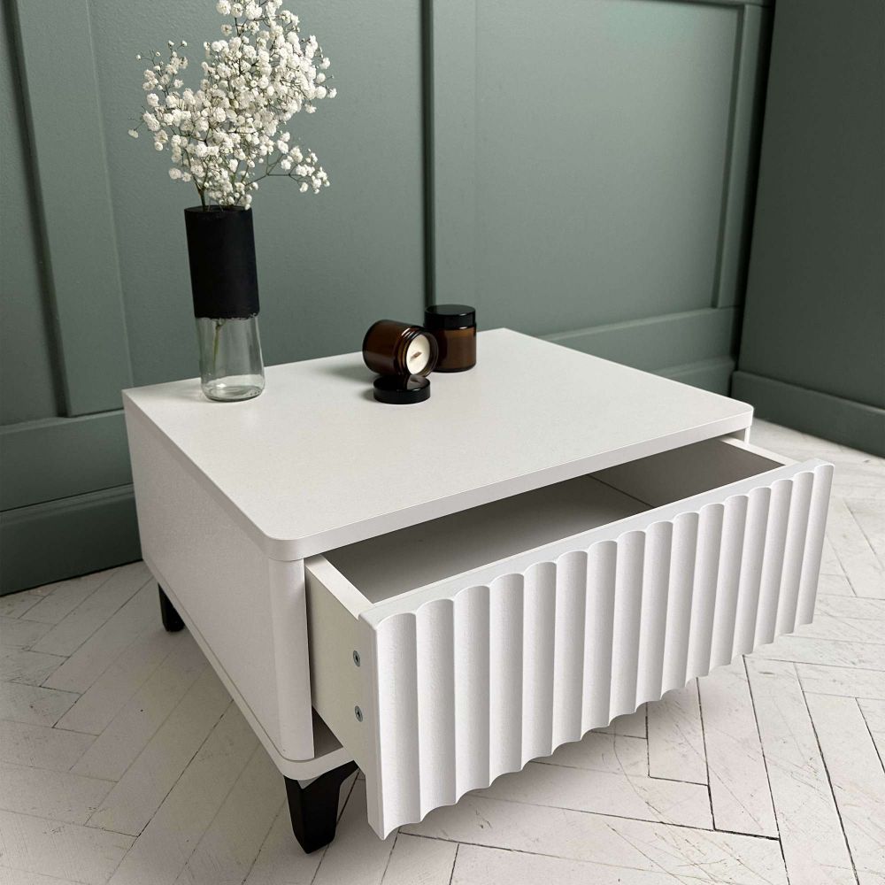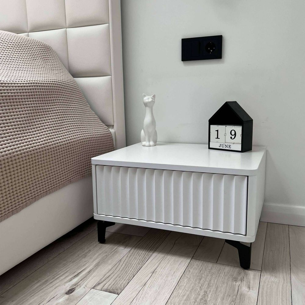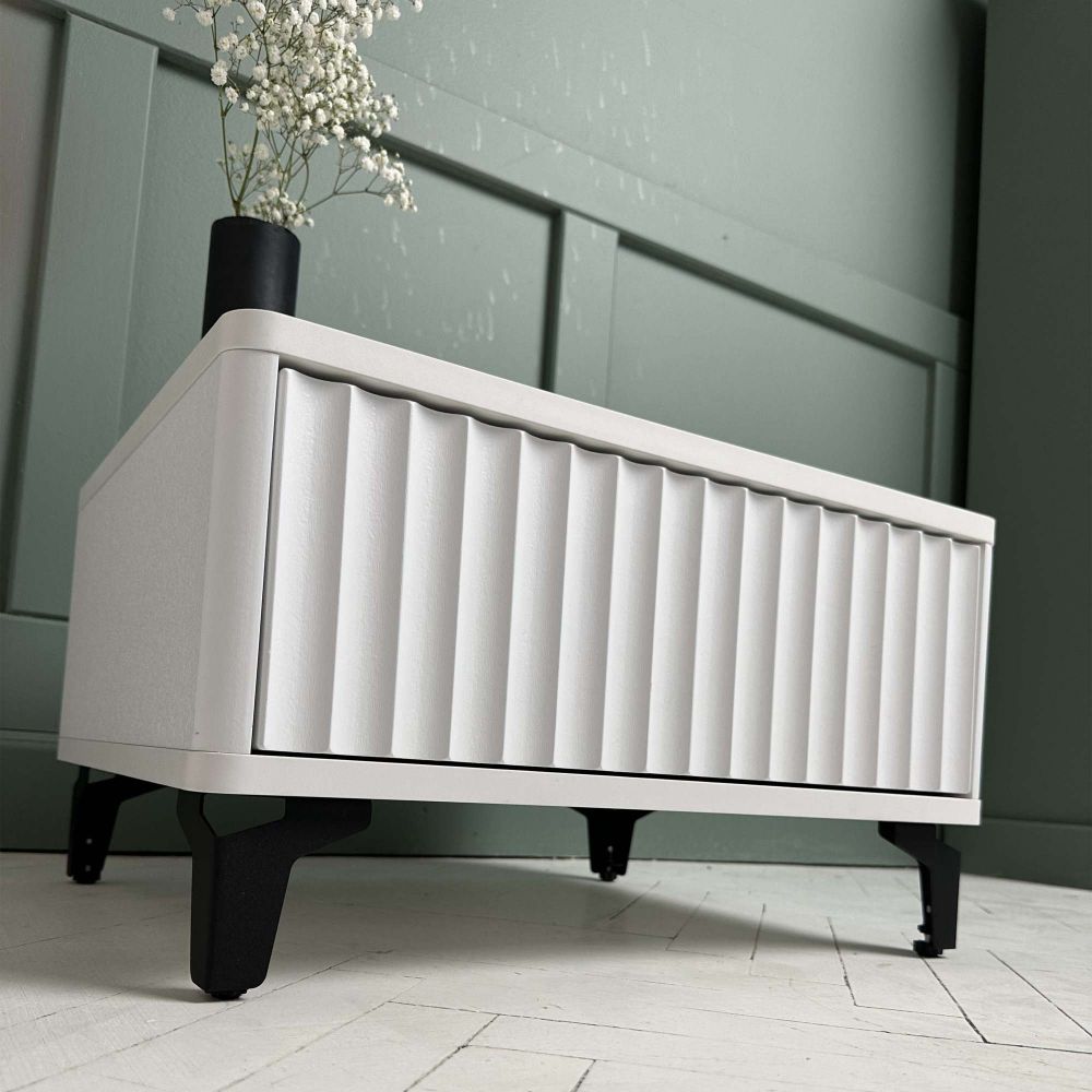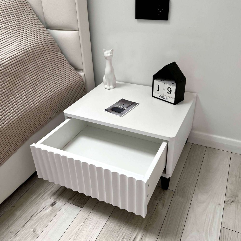 Особенность - фрезерованный фасад из пленки ПВХ с 3D фрезеровкой «Волна». Корпус из МДФ с покрытием пленки. Крышка и дно с закруглением из ЛДСП. Направляющие скрытого монтажа push to open.