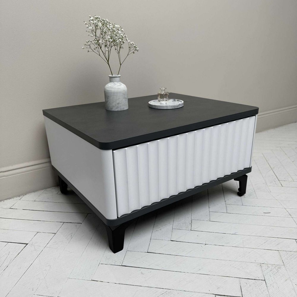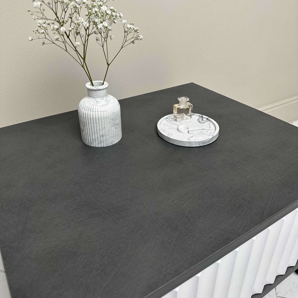 Особенность - фрезерованный фасад из пленки ПВХ с 3D фрезеровкой «Волна». Корпус из МДФ с покрытием пленки. Крышка и дно с закруглением из ЛДСП. Направляющие скрытого монтажа push to open.